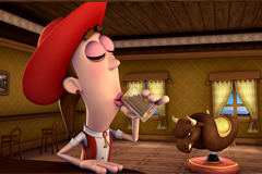 Banjo vai ao Saloon, bar da pequena cidade onde mora. Chegando lá vê Viola e, para impressioná-la, resolve montar o touro mecânico. Com isso acaba conquistando o coração da linda moça.