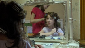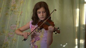 Little girl wants to be interesting for a boy with whom she attends the lessons of painting.